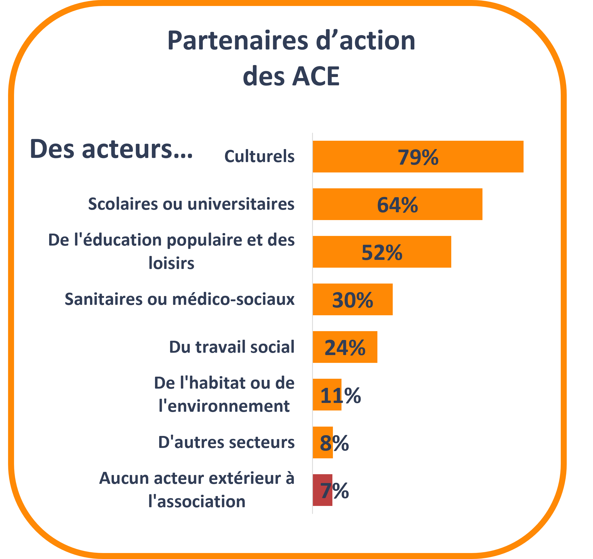 Le fonctionnement des associations culturelles employeuses repose sur un tissu dense de coopérations et de partenariats : 93 % d’entre elles déclarent travailler avec d’autres acteurs. Une large majorité est en lien avec d’autres acteurs culturels (79 %), mais aussi avec des établissements scolaires ou universitaires (64 %) et des structures de l’éducation populaire et des loisirs (52 %). Ces coopérations s’étendent également à d’autres champs, avec 30 % des associations culturelles employeuses en partenariat avec le secteur sanitaire et médico-social et 24 % avec le travail social.